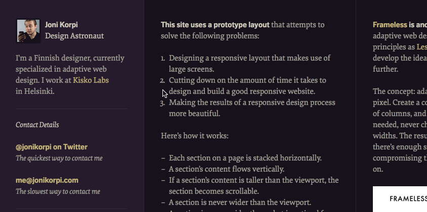 Also, the design of each these sections only requires 2 of the 3 states of a responsive design: just right and too small. The horizontal stacking takes care of too big. This leaves more opportunities for making interesting design decisions and cuts down on development time.